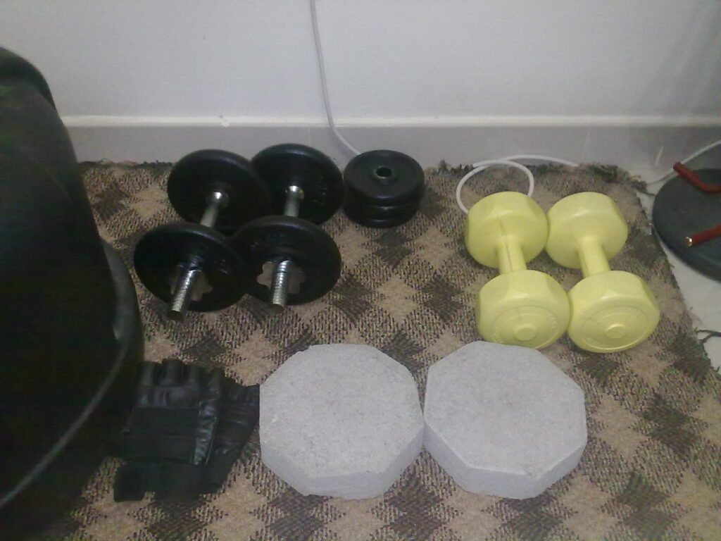 Basic weights 5- 6 kilos and concrete blocks for knuckle conditioning to strengthen the hands, wrists, and forearms so technique holds up under impact.