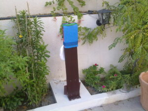 A makiwara is a traditional Okinawan karate tool: a padded, tapered wooden post set into the ground.